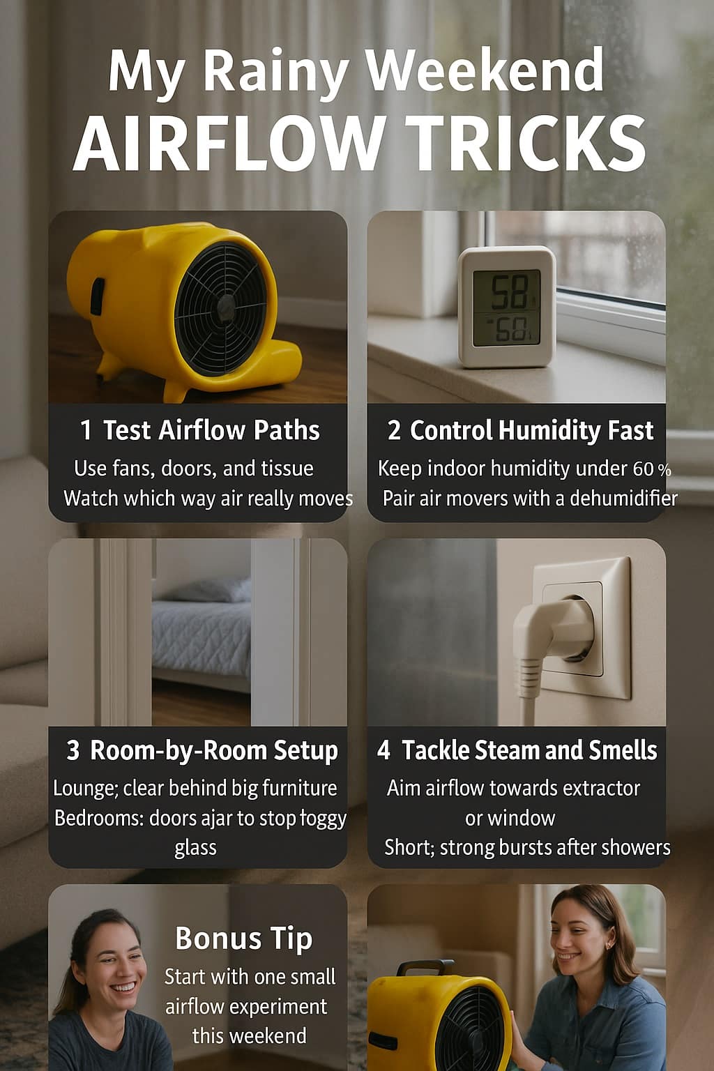 Small changes matter more than shiny gear. Moving a couch, opening a door slightly or angling a fan differently often does more than buying another device. My rainy weekend experiments made my home feel drier, fresher and more comfortable, and they even improved how I plan airflow on real jobs.