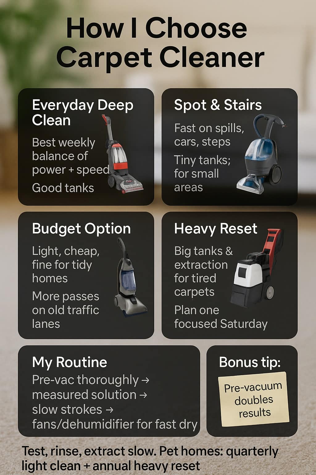 The real win is a routine: pre-vacuum well, use measured solution, move slowly, and extract dry. Pair a usable everyday machine with occasional heavy extraction, and your carpets will look cleaner for longer—and you won’t dread the chore. That’s how I choose, and that’s why my floors keep passing the sock test.