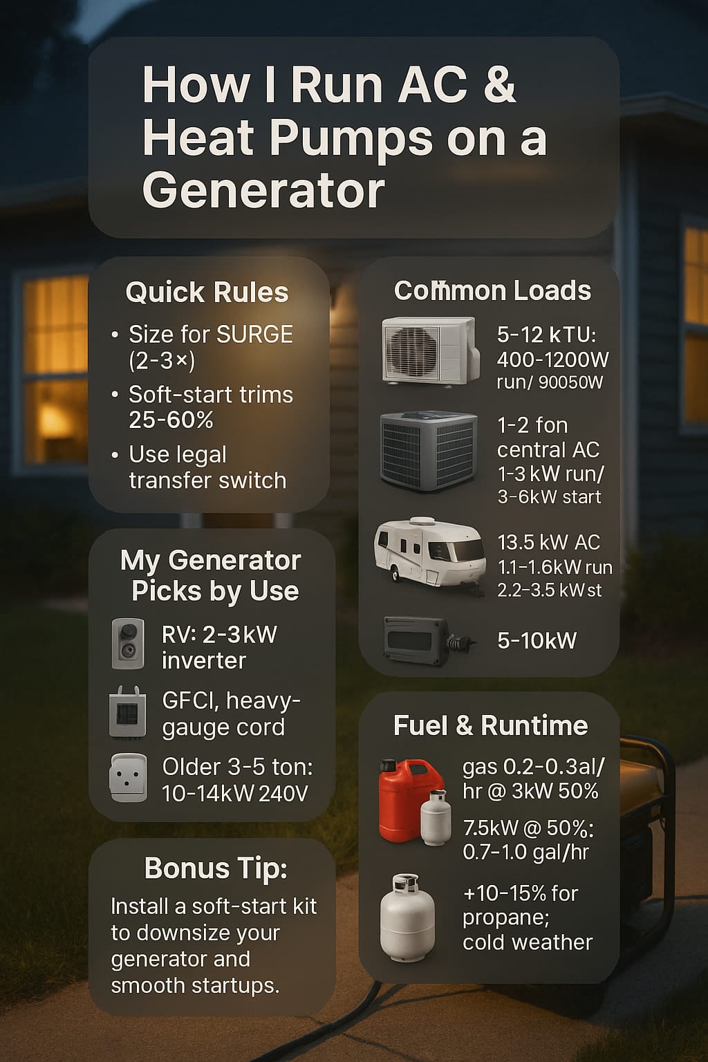 A summer thunderstorm took out power for a family with a 2-ton heat pump and two kids. My plan: install a soft-start, prioritize essential loads, and run a 7.5 kW inverter generator through a transfer switch. We tested on a hot afternoon, then rode out a two-day outage without a single trip.