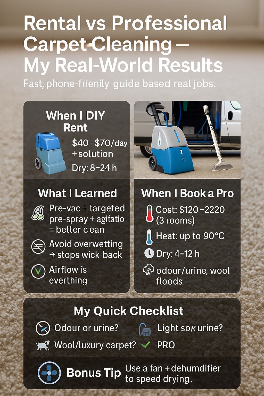 One winter, a party and a bottle of red turned my lounge into a blotchy map. I stood in the supermarket hire aisle doing mental math: a cheap rental and my sweat, or a professional visit and a higher invoice. I chose rental first, telling myself “it’s just water and suction.” That was naïve—and costly.