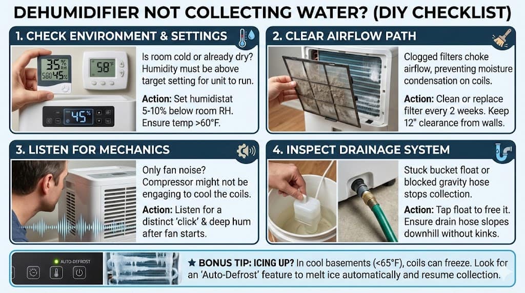 Why is my dehumidifier running but not collecting water? I usually find it’s either too cold in the room or the air filter is so dirty the air can’t reach the coils. Check your settings and give the filter a good wash before you panic or buy a new one.
