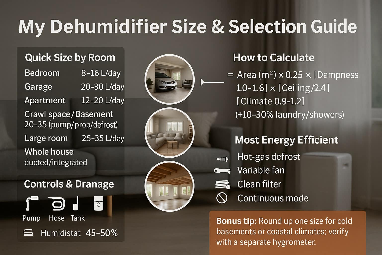I’ve sized dehumidifiers for bedrooms, garages, apartments, crawl spaces/basements, and whole homes. Here’s the simple, mobile-friendly method I actually use—and what I wish I knew at the start.