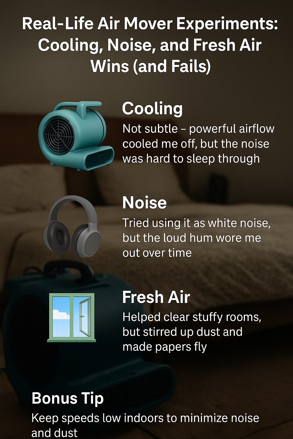My first genius idea: point an air mover straight at my bed on a hot night. At first it felt amazing – instant blast of cool air, blankets floating, sweat gone. Ten minutes later my eyes were dry, my throat felt like sandpaper and the noise felt more like a factory than a bedroom. My sleep quality tanked fast.