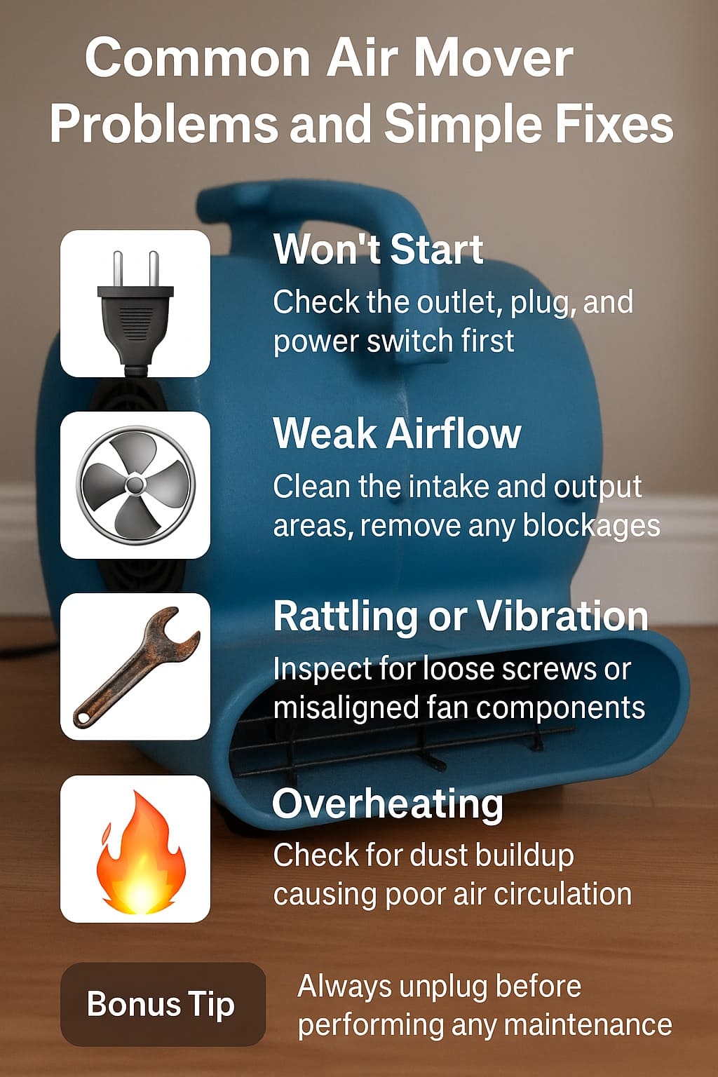 Learn how to spot common air mover problems, choose simple DIY fixes, and keep drying equipment safe before calling a repair shop. This guide explains warning signs, quick checks, and when to stop and protect your home, customers, and power circuits.