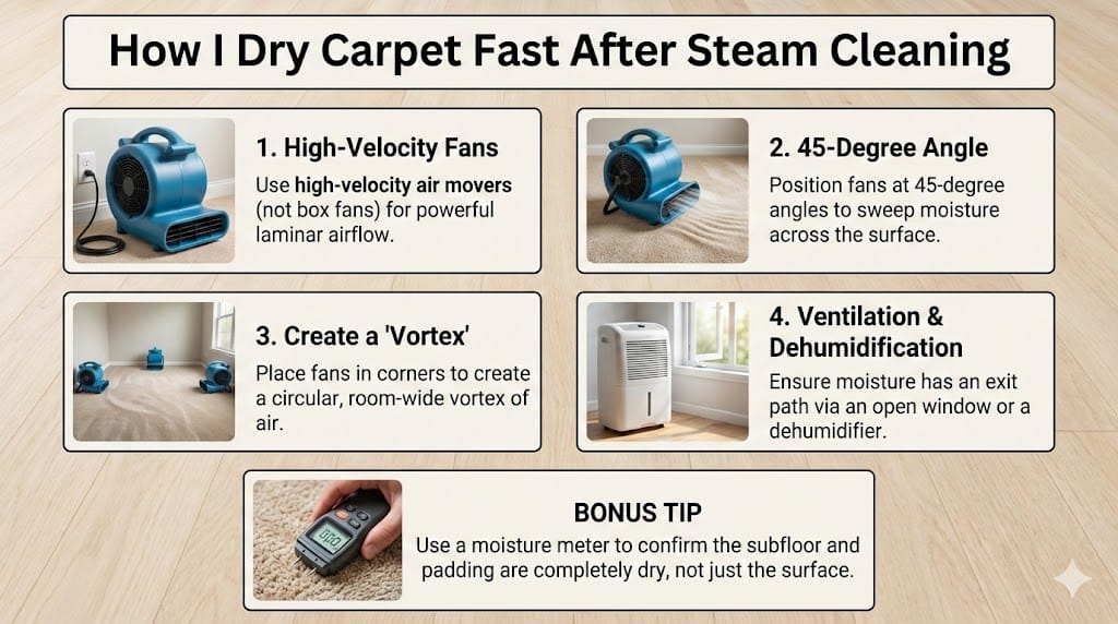 To dry carpet fast after steam cleaning, position high-velocity carpet dryer fans at 45-degree angles to create optimal laminar airflow. Proper ventilation combined with professional air movers reduces drying times from twenty-four hours to under four hours effectively.
