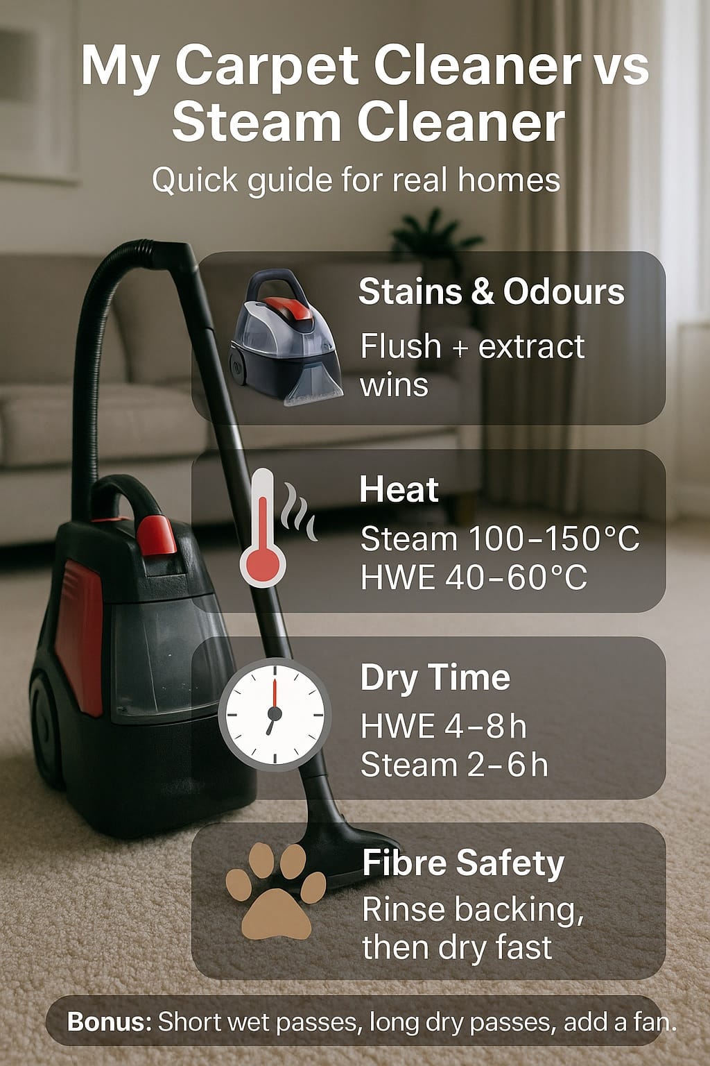 Compare carpet cleaner and steam cleaner for stain removal, fibre safety, drying time, and deep cleaning power. See temp ranges, costs, and when each wins for pets, allergies, rentals, and wool. Quick guide for busy homes choosing the right tool.