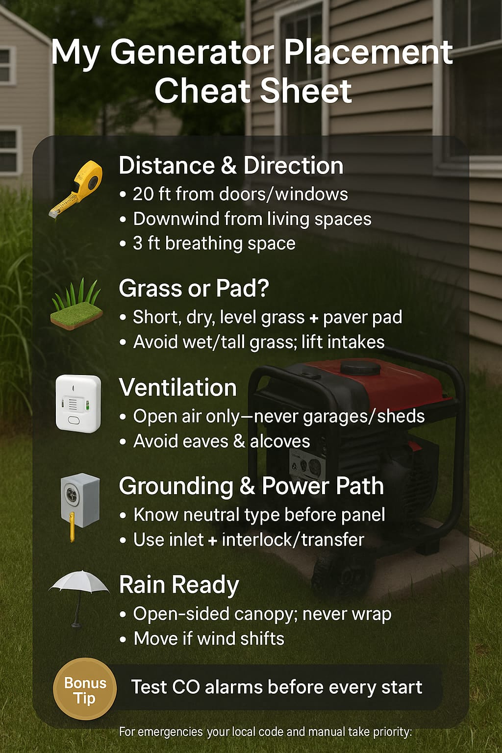 My Generator Placement Playbook: Grass, Distance, Venting & Grounding
