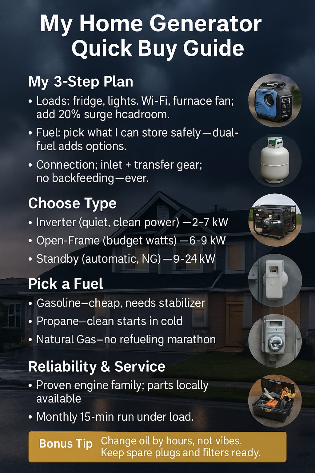 What I cover here: a short, human decision path that covers all the big queries—what generator should I buy/get, which generator brand is best, and which generator is the best for my risk.