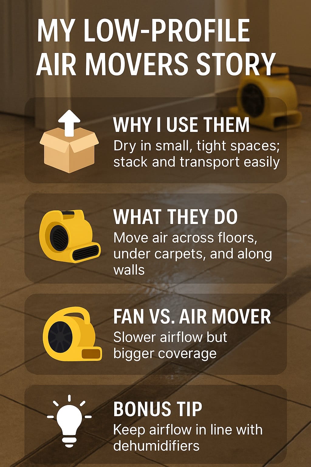 When I first bought low-profile air movers, I treated them like “backup” toys. Then I took them to a flooded unit with a skinny hallway and tiny bedrooms. My big snail fans didn’t fit anywhere sensible. The low-profile units slid in, lined up, and suddenly the job felt easy instead of awkward.