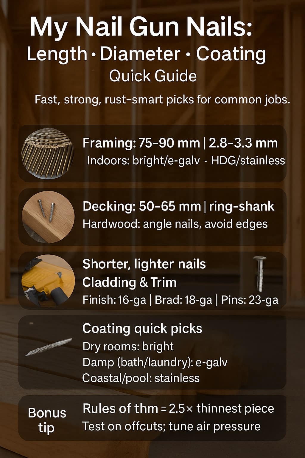 • I choose nail length, diameter, and coating together—never in isolation.