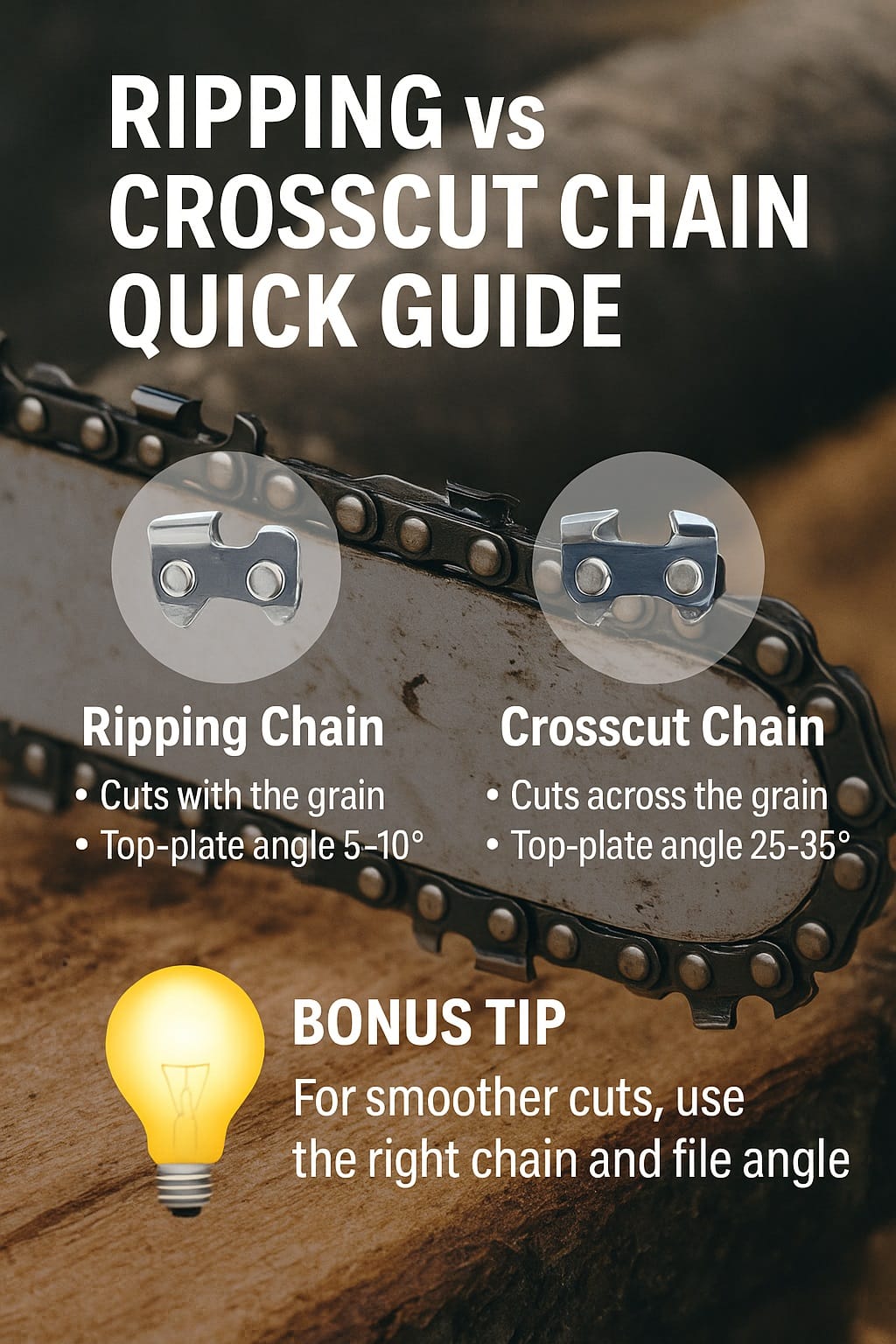A ripping chain is built for cutting with the grain, while a crosscut chain is built for cutting across the grain faster. The biggest difference is the top-plate filing angle, which changes chip shape, cutting feel, and surface finish. Pick the right chain and your saw works with you, not against you.
