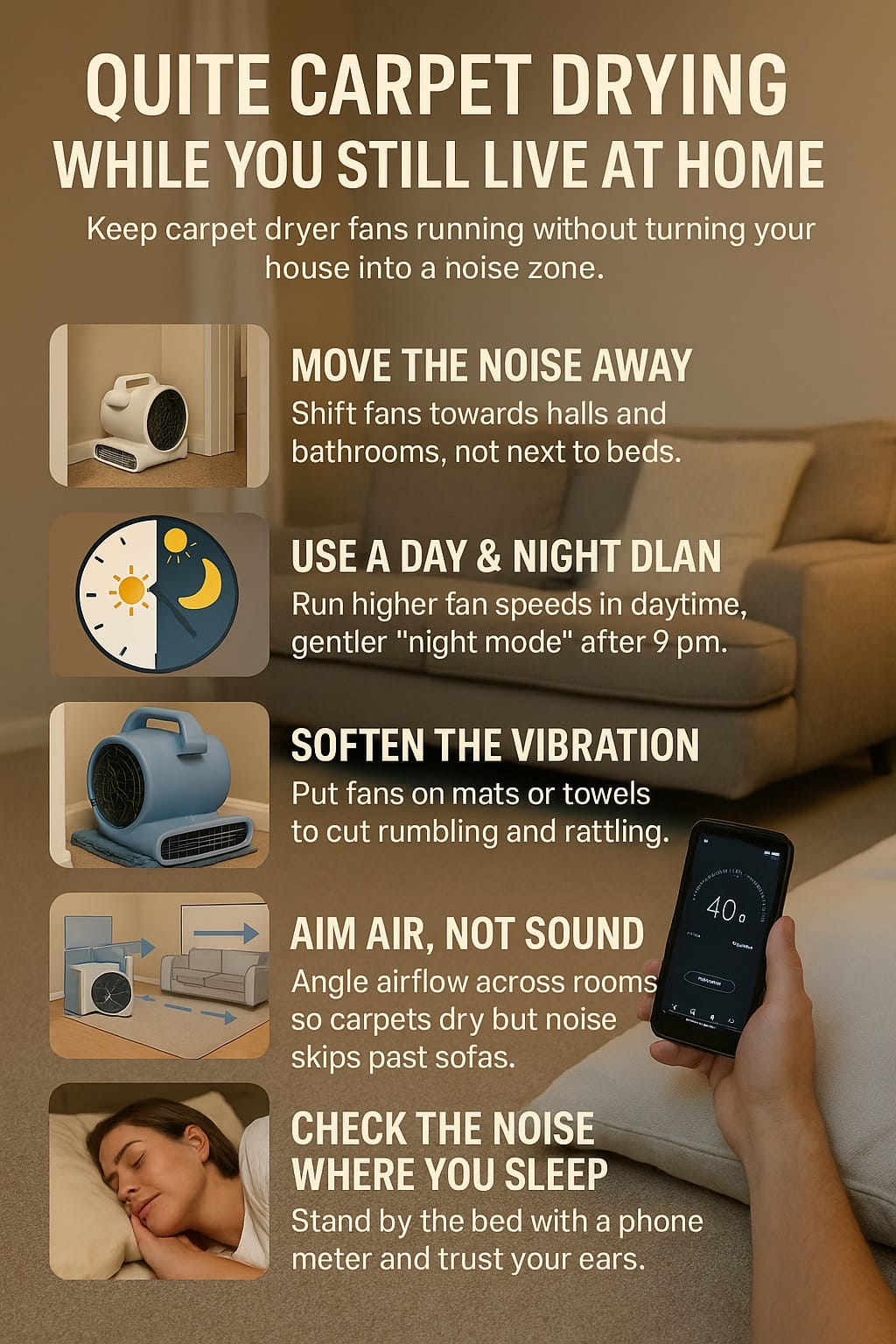Reducing carpet dryer fan noise, planning quiet carpet drying setups and using low-noise fan positioning helps families stay in the house while wet carpets recover after leaks or floods. Practical noise control protects sleep, comfort and communication without sacrificing drying time or safety.